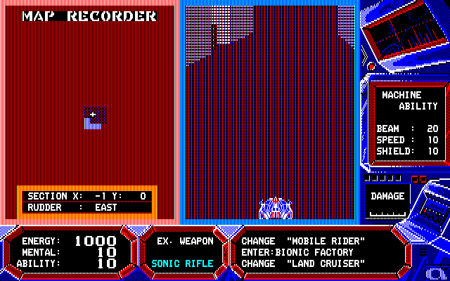 When the game starts up its not terribly clear what it is I'm supposed to be doing. Pressing the X key changes me between a flight mode, a tank mode, and a mech mode. None of these seem to do anything and there's no guidance. At this point I find the manual for the American release, because information for a different computer is better than no information. Turns out you select a weapon with a menu used by the ESC key, good to know